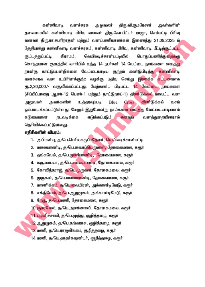 வேட்டைக்கு பயன்படுத்தப்பட்ட 14 நாய்களை விலங்குகள் நல அமைப்பை சேர்ந்த நபர்களிடம் ஒப்படைக்கப்பட்டது . மேலும் வேட்டையில் ஈடுபட்ட 14 நபர்களுக்கும் ரெண்டு லட்சத்து 30 ஆயிரம் ரூபாய் அபராதம் விதிக்கப்பட்டது.